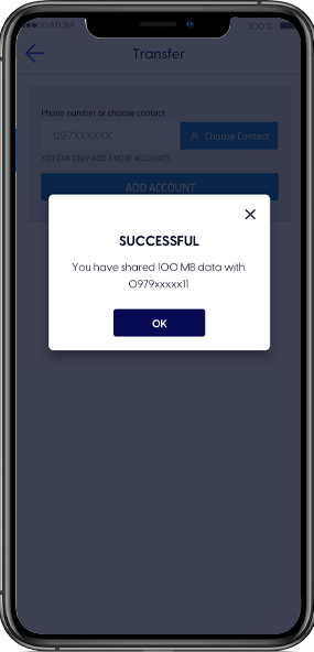 7) Both primary member and secondary member are not allowed to transfer their internet data, on-net call and SMS package of BOGO (Buy One Get One) Package to other ATOM users. However, primary member can share their BOGO Data Balance that purchase under BOGO (Buy One Get One) Package to secondary member with service charges. Maximum number of times and amount of data transfer are limited.