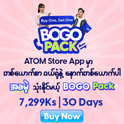 8) Regarding the plan expiry date, ATOM Myanmar will notify to the Customers who activate this package 2 days before expiry date. If primary member does not extend the BOGO (Buy One Get One) Package, data quota benefits of primary and secondary member will be forfeited after 30 days ( after the plan expiry), and their data usage, On-net Call and SMS will be deducted from either pack balance or Pay as You Go rate.