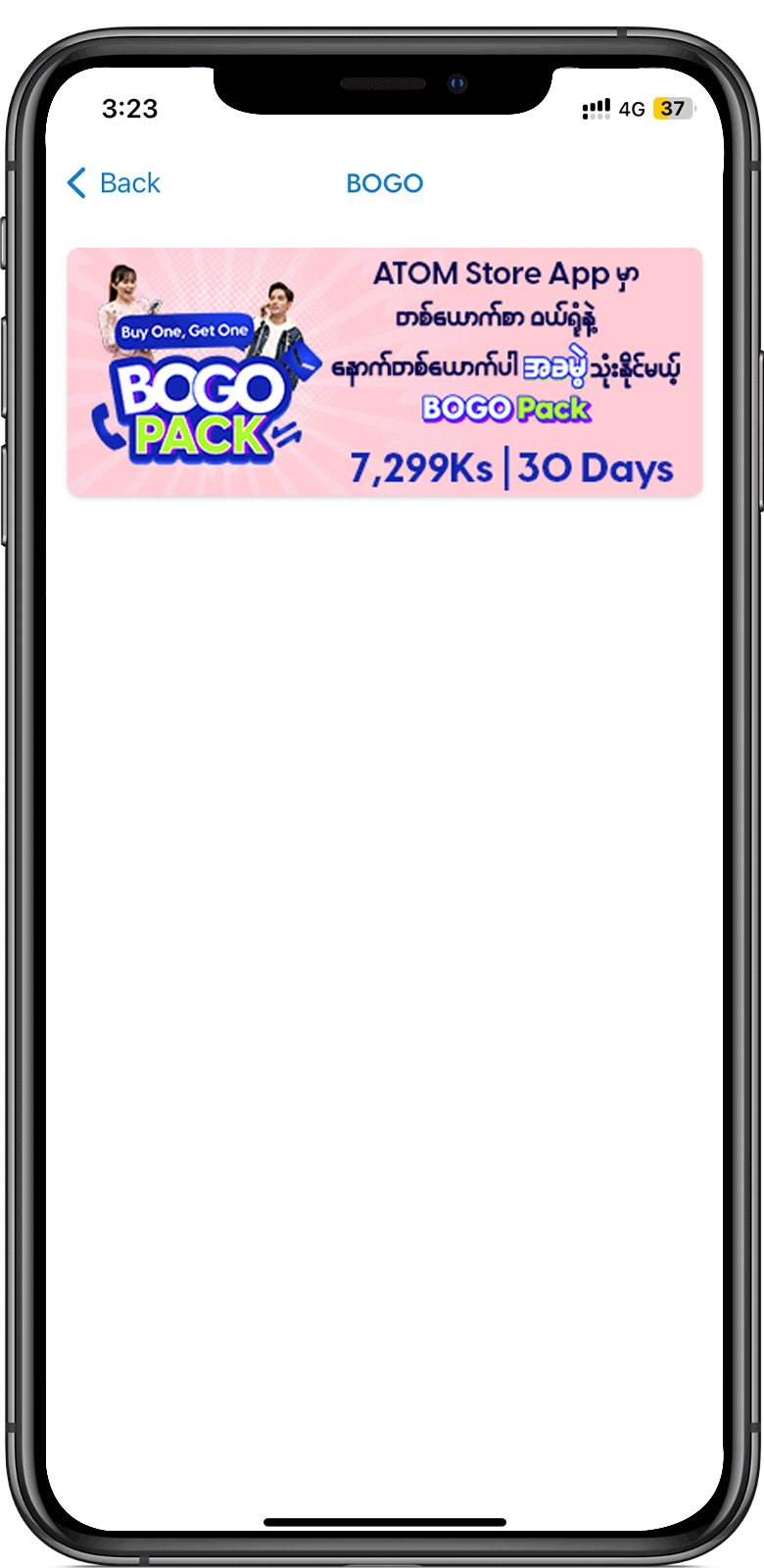 Download or Update ATOM Store APP latest version and click on “BOGO (Buy One Get One) Pack” Icon from home screen. By selecting the offer banner pack then adding a desire ATOM prepaid MSISDN and subscribe the pack.