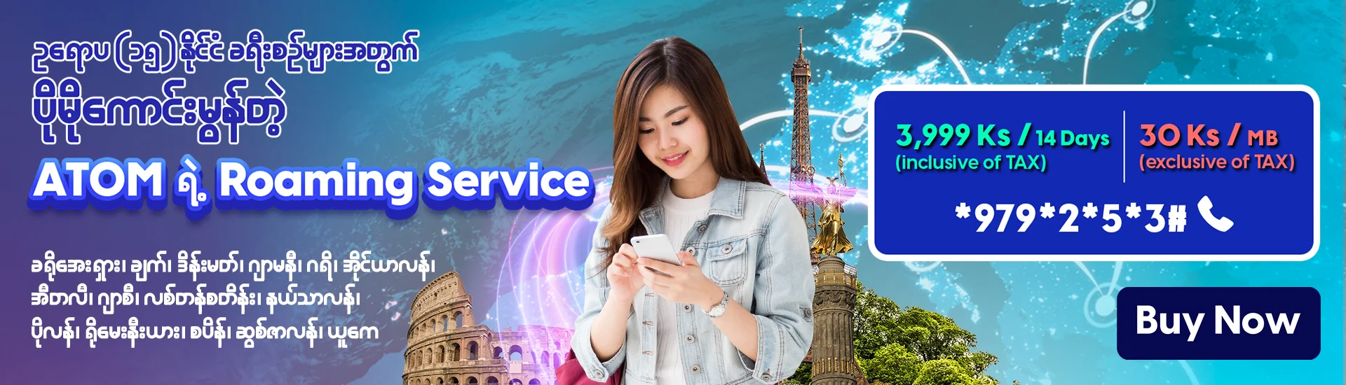 All ATOM prepaid subscribers can enjoy special PAYGO rate of 30 Ks/ MB (exclusive of Tax) data roaming while roaming in Croatia, Czech Republic, Denmark, Germany, Greece, Ireland, Italy, Jersey, Liechtenstein, Netherlands, Poland, Romania, Spain, Switzerland, and UK with the subscription fee of 4,999 MMK(Inclusive of Tax) (validity 14 days).