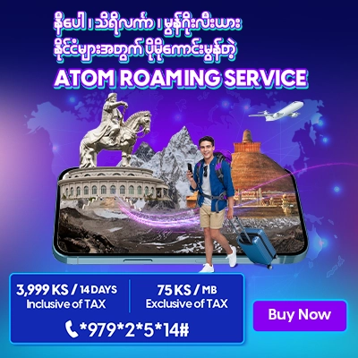 All ATOM prepaid subscribers can enjoy special PAYGO rate of 75 Ks/ MB (exclusive of Tax) data roaming while roaming in Nepal, Sri Lanka and Mongolia with the subscription fee of 4,999 MMK(Inclusive of Tax) (validity 14 days).