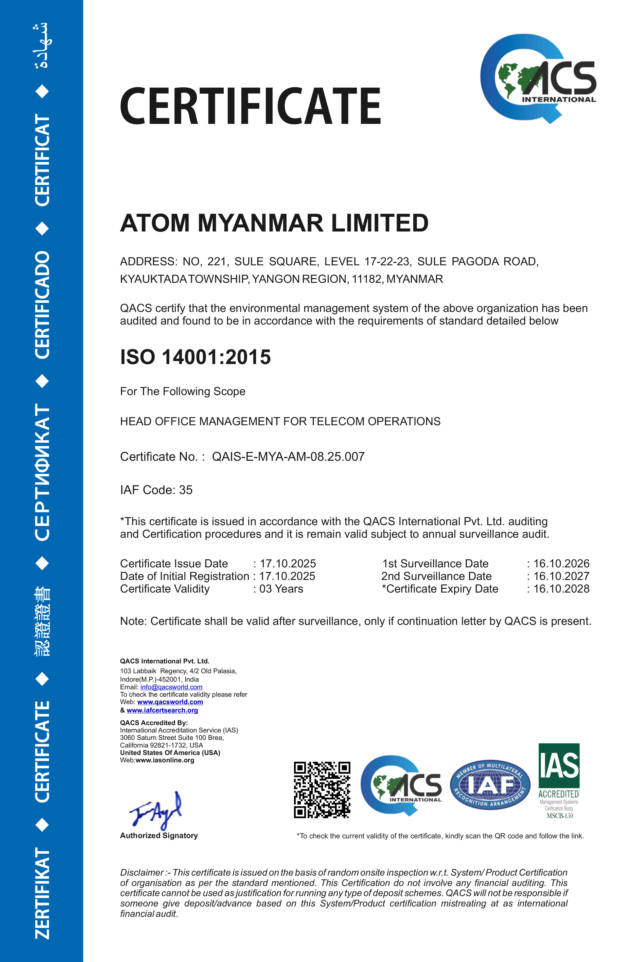 Yangon, Myanmar, 24th October 2025 – ATOM, Myanmar’s leading 4.5G VoLTE telecom provider, proudly announces the major milestone in its sustainability journey with the achievement of the internationally recognized ISO 14001:2015 certification for Head Office Management for Telecom Operations. This accomplishment reinforces ATOM’s position as a sustainability-driven organization, dedicated to reducing its environmental risks and creating a greener, more resilient future for Myanmar.