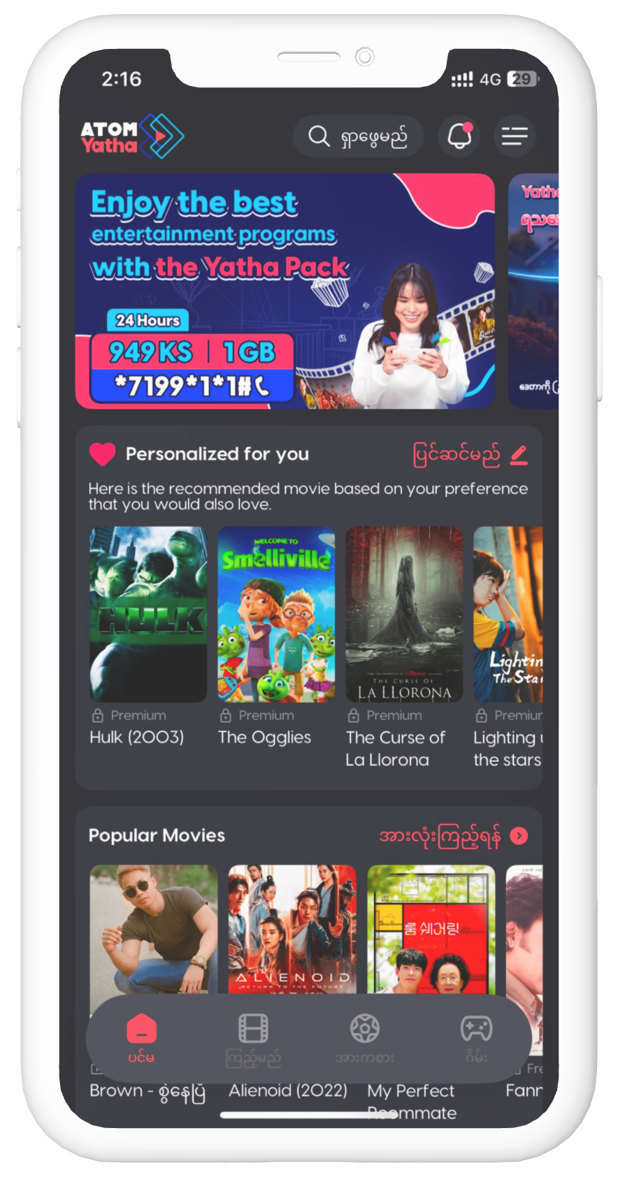 “အက်တမ် ရသ”  Application ထဲက အစီအစဥ်တွေကို  Yatha Pack နဲ့ကြည့်လို့ရပြီး ကြည့်ရှုမှုအတွက် ဒေတာကုန်ကျစရိတ်ကို Yatha Pack ထဲကသာ ဖြတ်သွားမှာဖြစ်ပါတယ်။