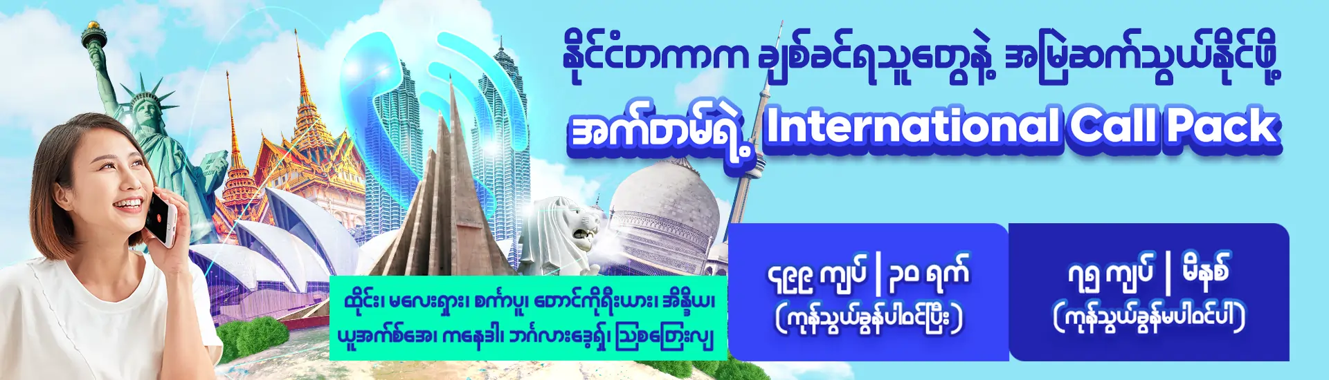 ယခုအစီအစဥ်ဖြင့် ၉ နိုင်ငံရှိ (ထိုင်း၊ မလေးရှား၊ စင်ကာပူ၊ တောင်ကိုရီးယား ၊အိန္ဒိယ ၊ယူအက်စ်အေ ၊ကနေဒါ ၊ဘဂ်လားဒေ့ရှ် ၊ သြစတေးလျ နိုင်ငံများ) မည်သည့် မိုဘိုင်လ်း နှင့် လိုင်းဖုန်းများကို (Premium နှင့် Satellite ဖုန်းများမပါ) ခေါ်ဆိုနိုင်ပါသည်။