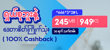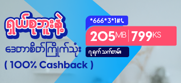 ၅။ အလိုအလျောက်သက်တမ်းတိုး ပက်ကေ့ချ်များသည် (တစ်ကြိမ်ထပ်ပိုသော ထပ်မံဝယ်ယူခြင်းကို ပြုလုပ်နိုင်) ဒေတာလက်ကျန် 50 MB အောက်ရောက်ပါက အလိုအလျောက်သက်တမ်းတိုး ဝယ်ယူသွားမည်ဖြစ်ပြီး ဝယ်ယူထားသော ပက်ကေ့ချ်စျေးနှုန်းအတိုင်း လက်ကျန်ငွေမှ ဖြတ်တောက်သွားမည်ဖြစ်ပါသည်။ လက်ကျန်ငွေလုံလောက်မှုမရှိပါက အလိုအလျောက်သက်တမ်းတိုး ဝယ်ယူမှု မအောင်မြင်နိုင်ပါ။ ရှယ်စုဘူး အလိုအလျောက် သက်တမ်းတိုးပက်ကေ့ချ်များကို သက်ဆိုင်ရာ USSD code များကိုခေါ်ဆို၍ ပယ်ဖျက်နိုင်ပါသည်။ အသေးစိတ်ကို FAQs တွင် ဖတ်ရှုနိုင်ပါသည်။